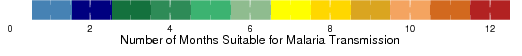 This map shows the number of months suitable for malaria transmission, based on climatological averages. Suitability is defined as the coincidence of precipitation accumulation greater than 80 mm, mean temperature between 18°C and 32°C, and relative humidity greater than 60%.