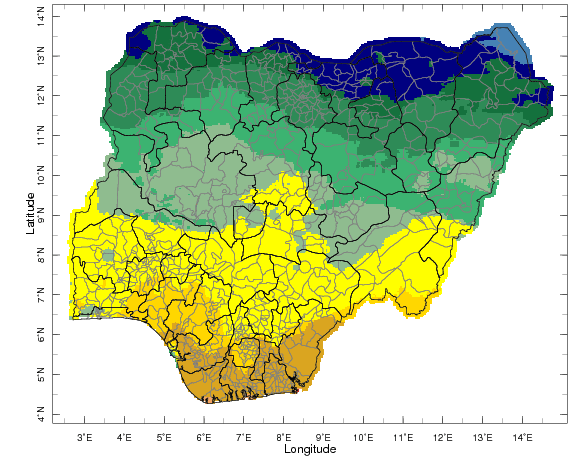 Precipitation climatology is compiled on a 0.0375° x 0.0375° lat/lon grid from ENACTS precipitation data set. Temperature climatology is compiled on a 1km x 1km lat/lon grid from United States Geological Survey (USGS) LandDAAC MODIS. Relative Humidity climatology is compiled on a 2.5° x 2.5° lat/lon grid from NCEP/NCAR CDAS/Reanalysis.
